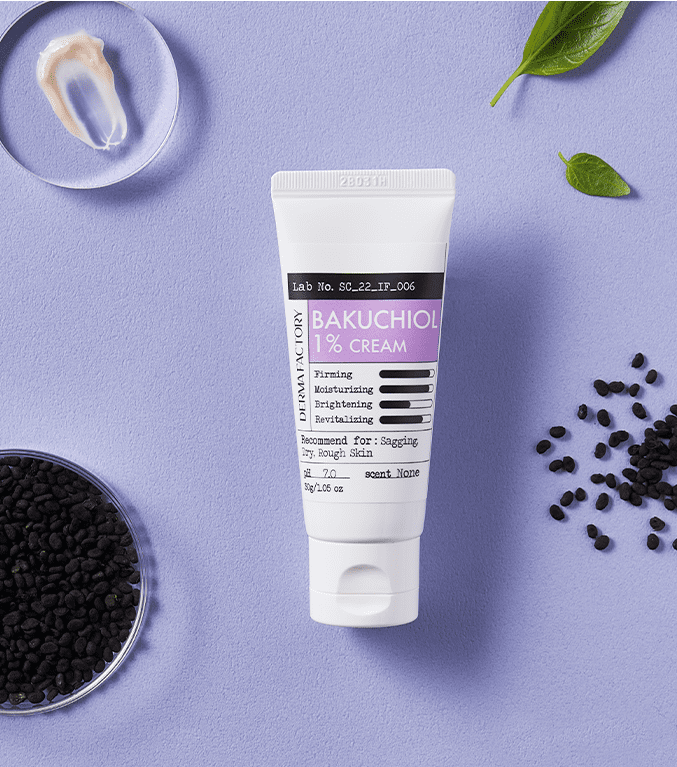 1% Content of Bakuchiol: Containing 1% Bakuchiol (aka vegetable retinol), DERMA FACTORY Bakuchiol 1% Cream gently adheres to the skin, providing effective intensive care for skin elasticity regardless of day or night.